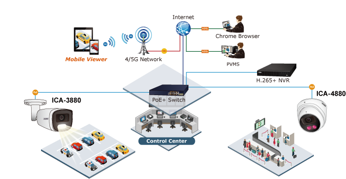 Remote management makes you easy to set the configuration and live viewing via Mobile app, NVR, HDVR, and Web browser. Besides, the ICA-4880 provides central surveillance management capability with the adoption of its bundled PLANET Video Management Software. With the PVMS, the ICA-4880 is expandable for multi-sites management of up to 256-ch IP cameras simultaneously. Users are able to monitor the IP cameras anytime, anywhere.