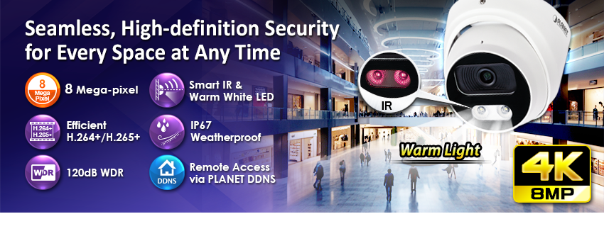 PLANET ICA-4880 8-megapixel PoE IP cam, equipped with dual IR and warm white LEDs, delivers adaptable performance in various lighting conditions, enabling clear color footage in low light and optimal visibility in total darkness. This flexibility is ideal for indoor and semi-enclosed areas like building entrances, offices, and corridors. The ICA-4880 supports 802.3af/at PoE for power over Ethernet, simplifying installation without external power. With integrated PVMS, NVR, HDVR, and user-friendly web interfaces, this camera is the ultimate choice for reliable, high-quality indoor surveillance.