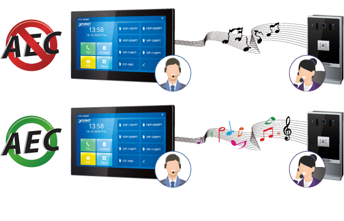 Experience PLANET’s crystal clear sound in the HDP-1261PT Door Phone and VTS-700WP SIP Indoor Touch Screen PoE Video Intercom. The Acoustic Echo Cancellation (AEC) technology is adopted in PLANET’s HDP-1261PT Door Phone and VTS-700WP SIP Indoor Touch Screen PoE Video Intercom to minimize the sound signal distortion. In addition, with echo suppression, you’ll feel like you’re talking to your caller face-to-face, thus guaranteeing the best-in-class sound quality.