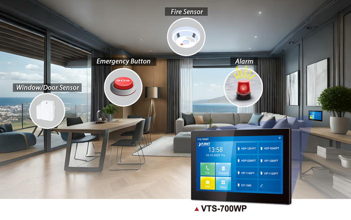 Its simple user interface enables you to easily arm and disarm your home security system, view status of doors and door locks, and see live video from cameras in and around the house – all at the touch of a button. Quick-read information, such as time, and more are available via on-screen widgets that are constantly updated. One glance at the display panel shows who is outside your door, and you can decide to start a dialogue or open the door lock. In addition, with PLANET IP PBX and IP intercoms, the VTS-700WP makes the door communication system comprehensive and easy.
